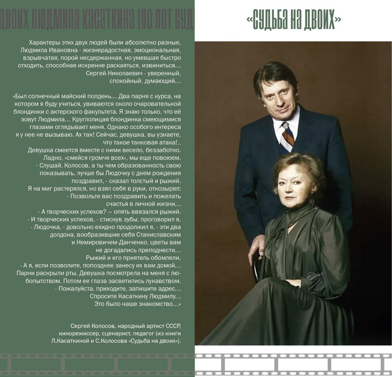 31 мая 2025 года прошло финальное мероприятие проекта «Судьба на двоих», приуроченного к 100-летию народной артистки Людмилы Касаткиной. С начала года в рамках проекта прошли 15 мероприятий: день памяти на Новодевичьем кладбище, пресс-конференция проекта в ИТАР-ТАСС, открылись масштабные выставки на Мосфильме, на Страстном бульваре, в Центральном театре российской армии, в Учебном театре ГИТИСа, прошел вечер памяти в Центральном театре российской армии, авторские встречи «Творческие династии» прошли в Культурном центре Фазиля Искандера с Андреем Райкиным, в Центральном доме актера с Михаилом Богдасаровым, на Экспериментальной сцене Центрального театра российской армии с Алексеем Колосовым, мастер-классы по актерскому и сценическому мастерству провели Анна Колосова (в Учебном театре ГИТИСа и на экспериментальной сцене ЦТРА) и народный артист Валерий Абрамов (на экспериментальной сцене ЦТРА).